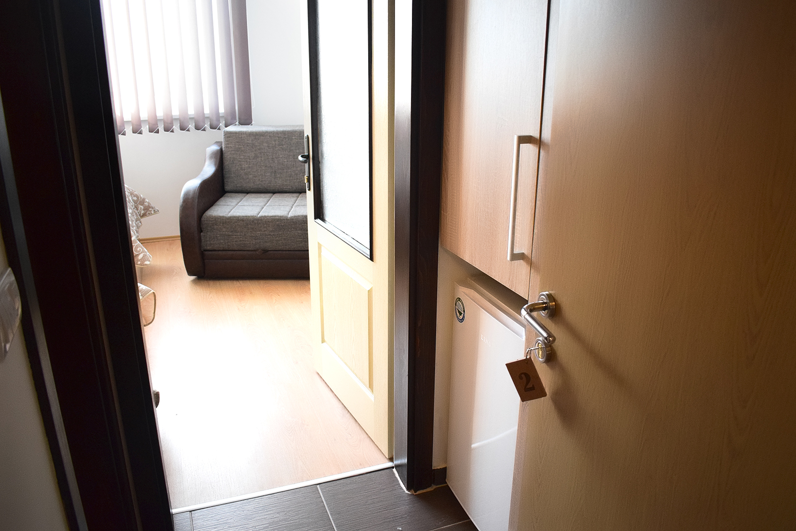 Soba 2 Soba br. 2 Soba br. 2 se sastoji od predsoblja, sobe i kupatila. Broj osoba: 2+1 Dva odvojena kreveta i fotelja na razvlačenje Površina: 18m² Frižider LCD TV WiFi internet