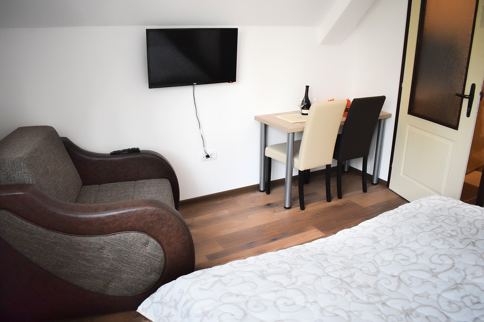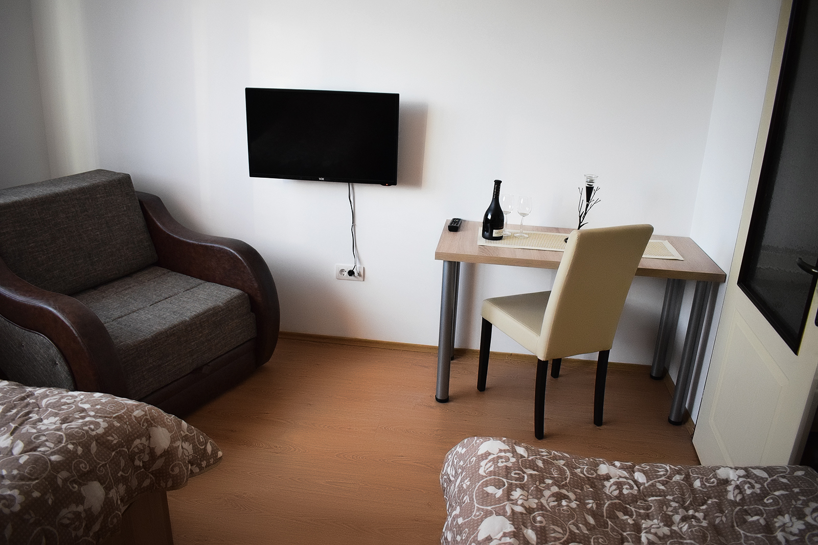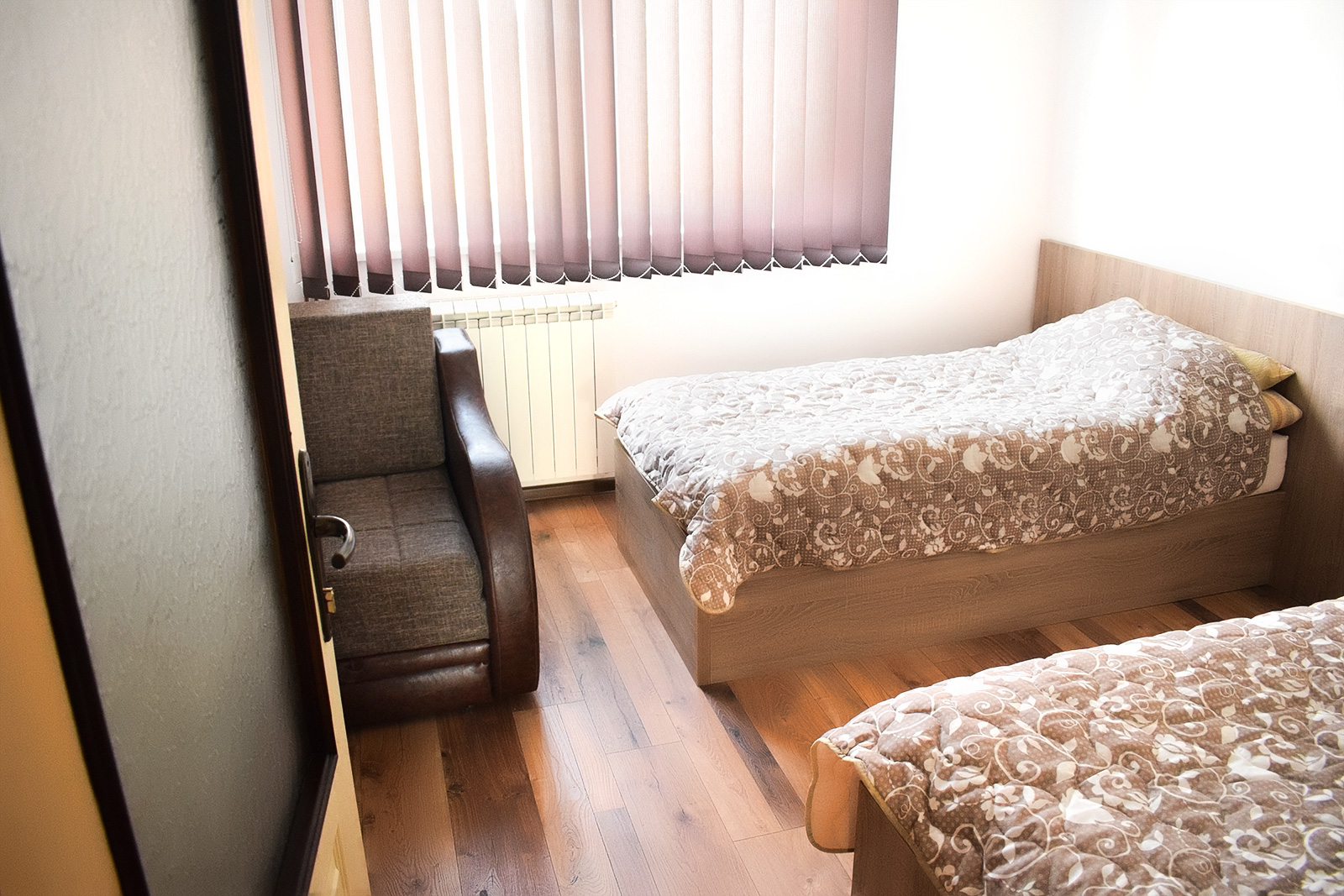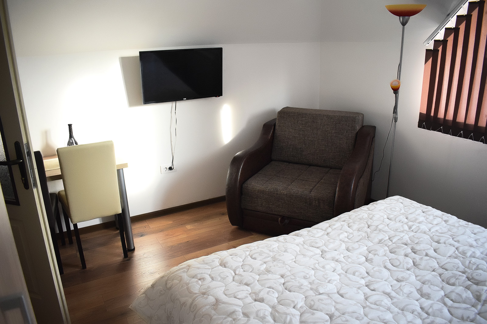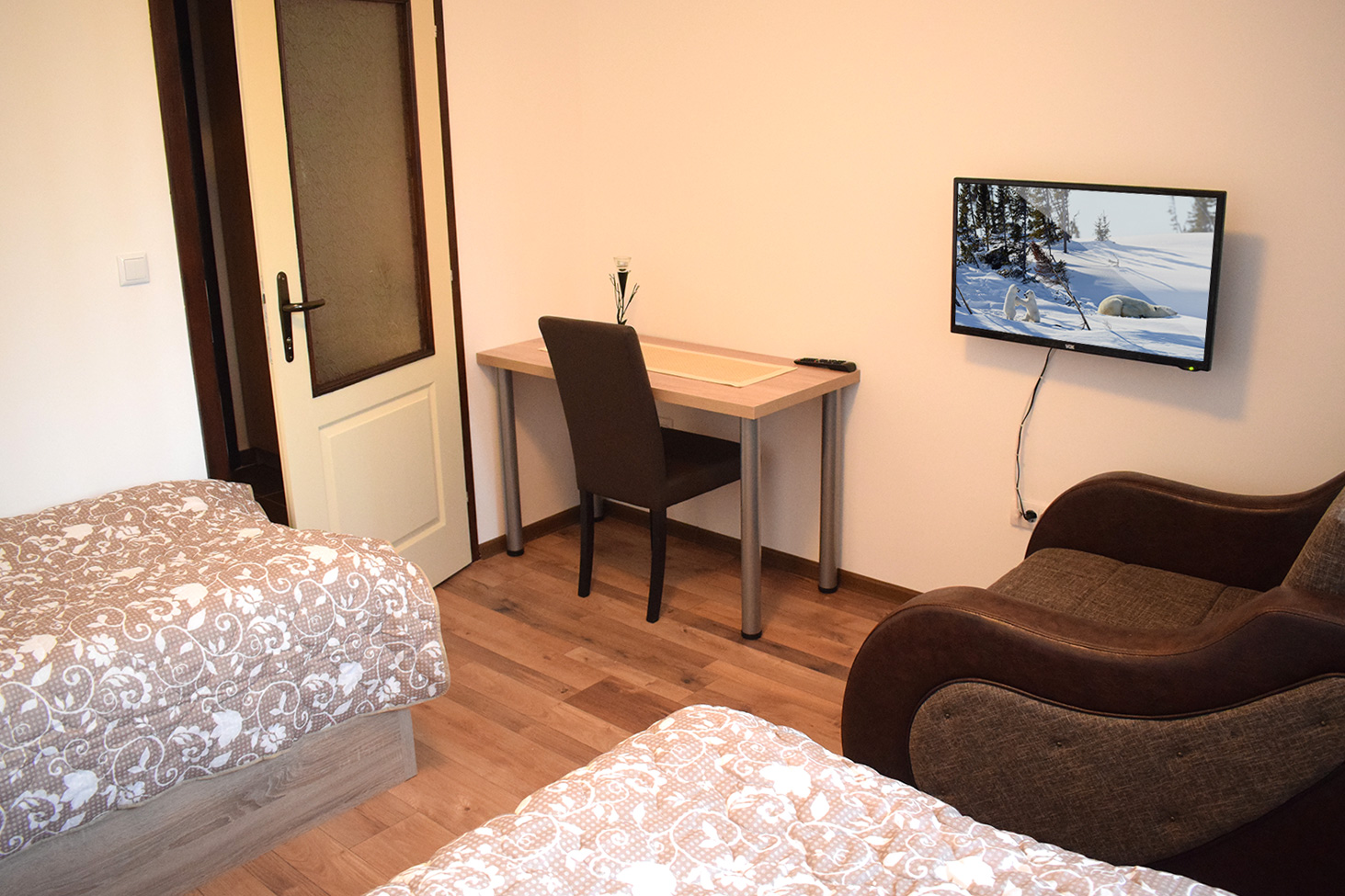 Soba 5 Soba br. 5 Soba br. 5 se sastoji od predsoblja, sobe i kupatila. Broj osoba: 2+1 Dva odvojena kreveta i fotelja na razvlačenje Površina: 18m² Frižider LCD TV WiFi internet