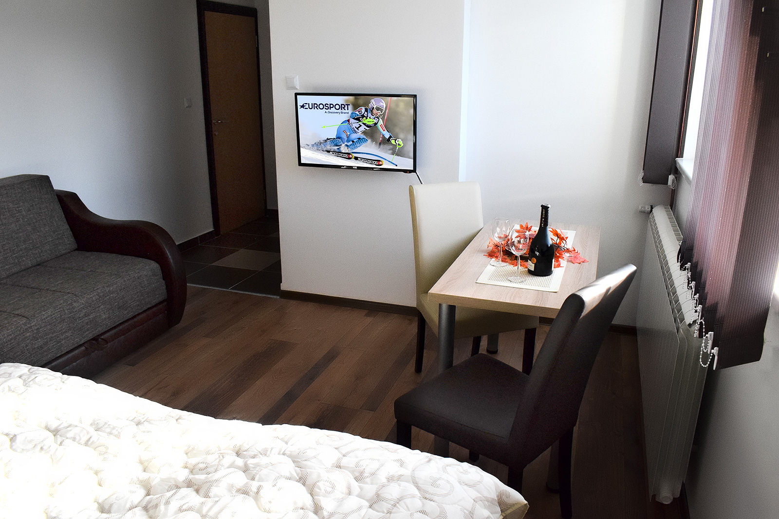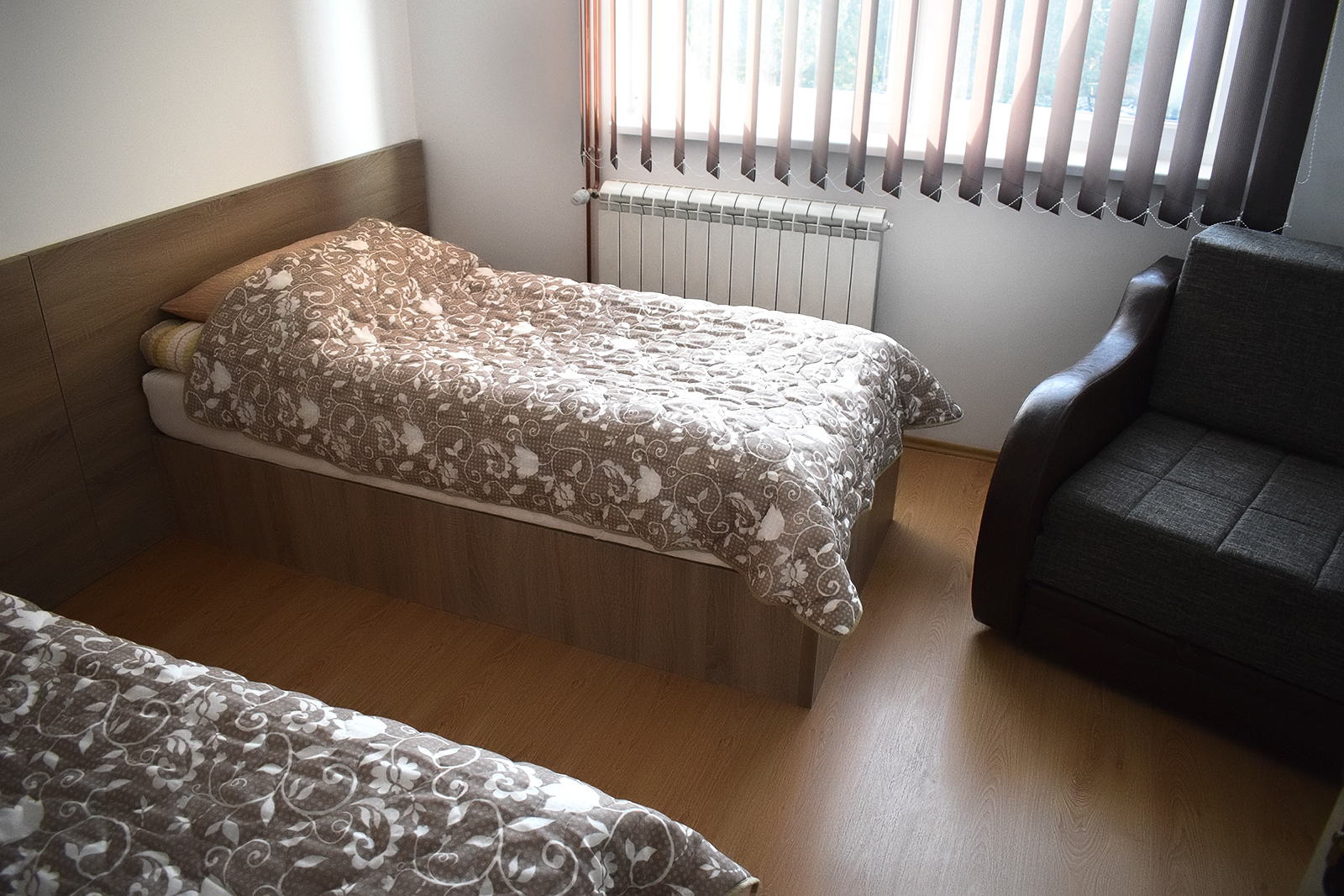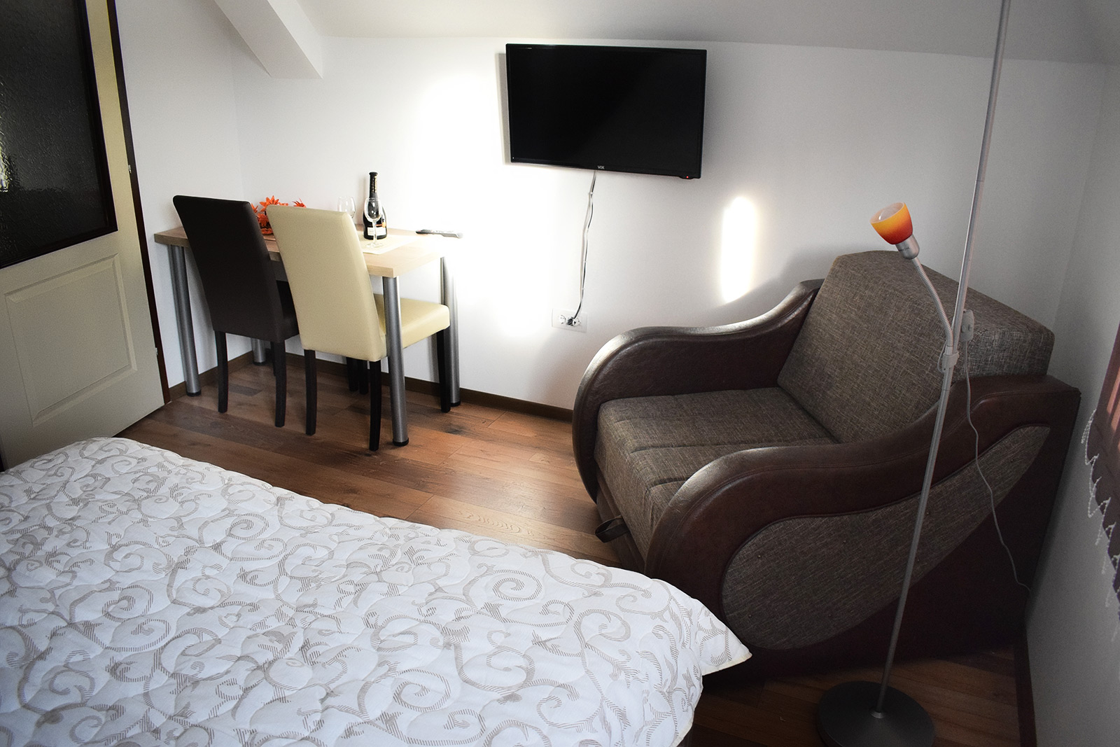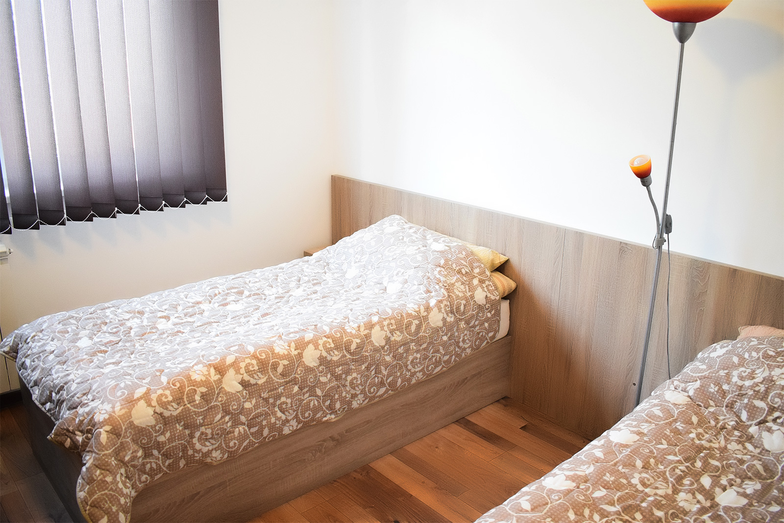 Soba 5 Soba br. 5 Soba br. 5 se sastoji od predsoblja, sobe i kupatila. Broj osoba: 2+1 Dva odvojena kreveta i fotelja na razvlačenje Površina: 18m² Frižider LCD TV WiFi internet