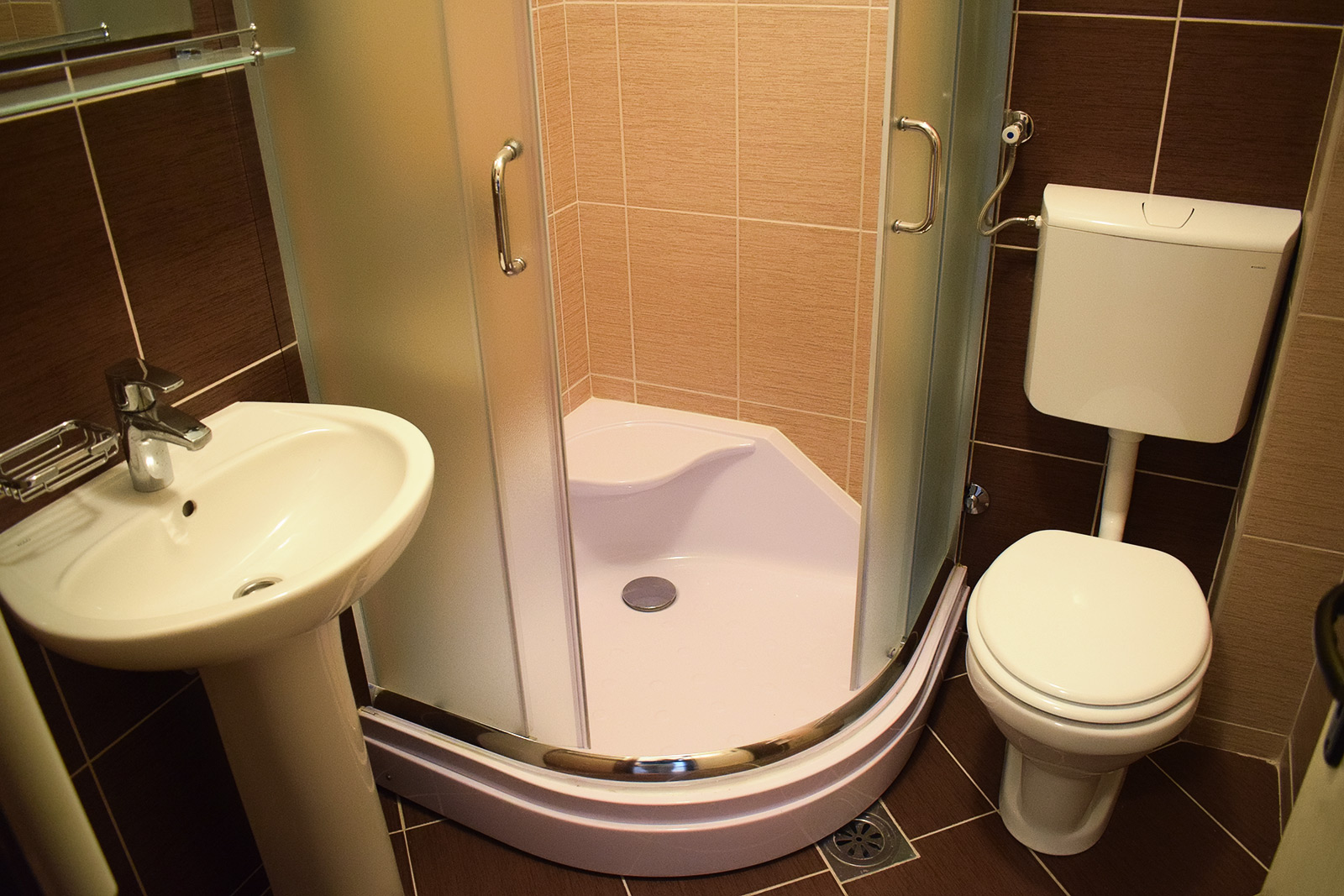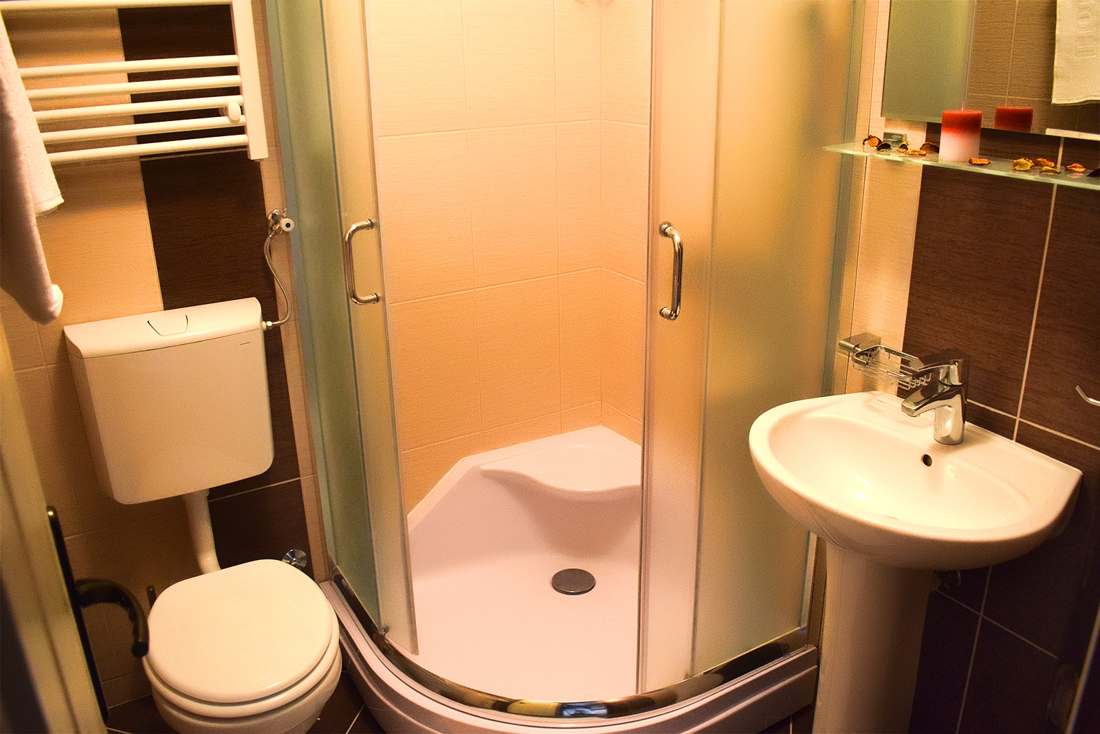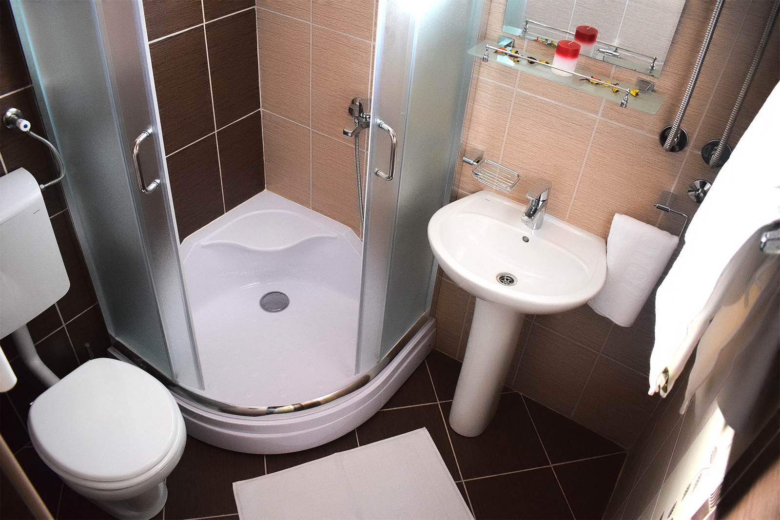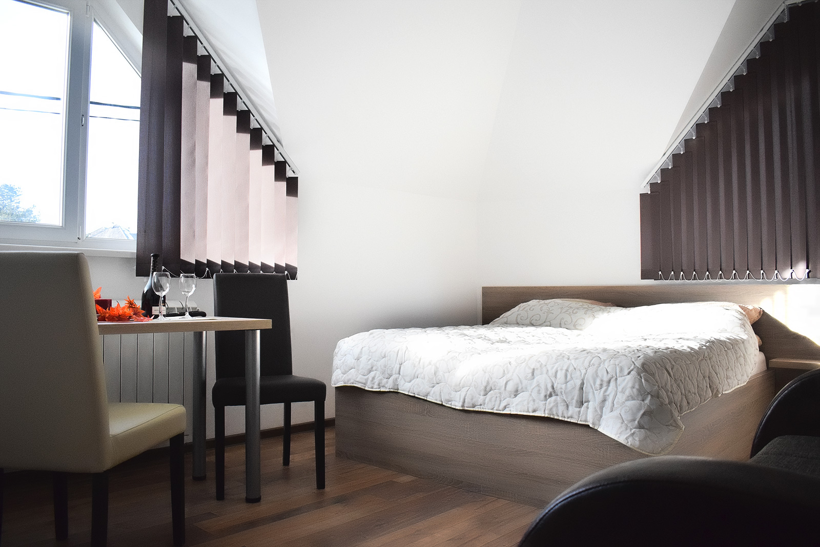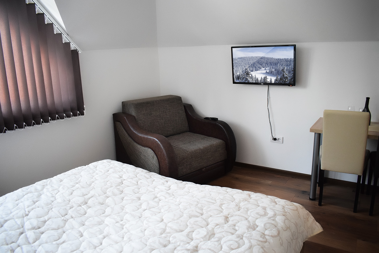 Soba 5 Soba br. 5 Soba br. 5 se sastoji od predsoblja, sobe i kupatila. Broj osoba: 2+1 Dva odvojena kreveta i fotelja na razvlačenje Površina: 18m² Frižider LCD TV WiFi internet